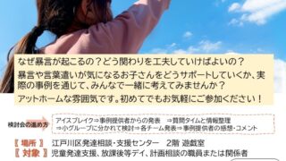 お友達と一緒に遊べない時、立ち歩いてしまう時、指示が伝わらない時などお子さんが集団行動に入れない場合はどうサポートしていくか、実際の事例を通じて一緒に考えてみませんか? アットホームな雰囲気で開催いたしますので、初めてで … 続きを読む 令和5年度 第3回 発達支援地域事例検討会-集団活動への参加が難しいお子さんへの支援方法-