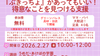 日程:令和8年2月27日(金)時間:10時00分~12時00分 場所:江戸川区グリーンパレス 高砂・羽衣 ※開催場所が変更になりましたのでお間違えないようお願いいたします対象:江戸川区内在住の発達が気になる未就学児~学齢 … 続きを読む 令和7年度 第6回 発達が気になる子の親支援講座「『ぶきっちょ』があってもいい!得意なことを見つける支援」