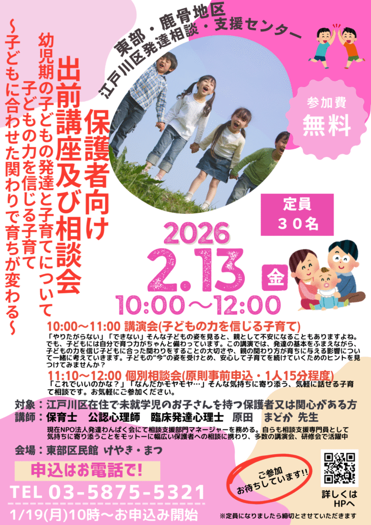 保護者向け 出前講座及び相談会「幼児期の子どもの発達と子育てについて」子どもの力を信じる子育て-子どもに合わせた関わりで育ちが変わる-