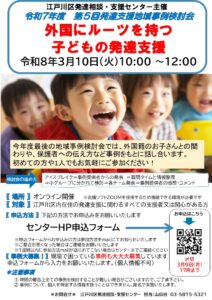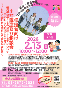 対象:江戸川区内在住の発達が気になる未就学児~学齢期のお子さんをお持ちの保護者又は関心がある方