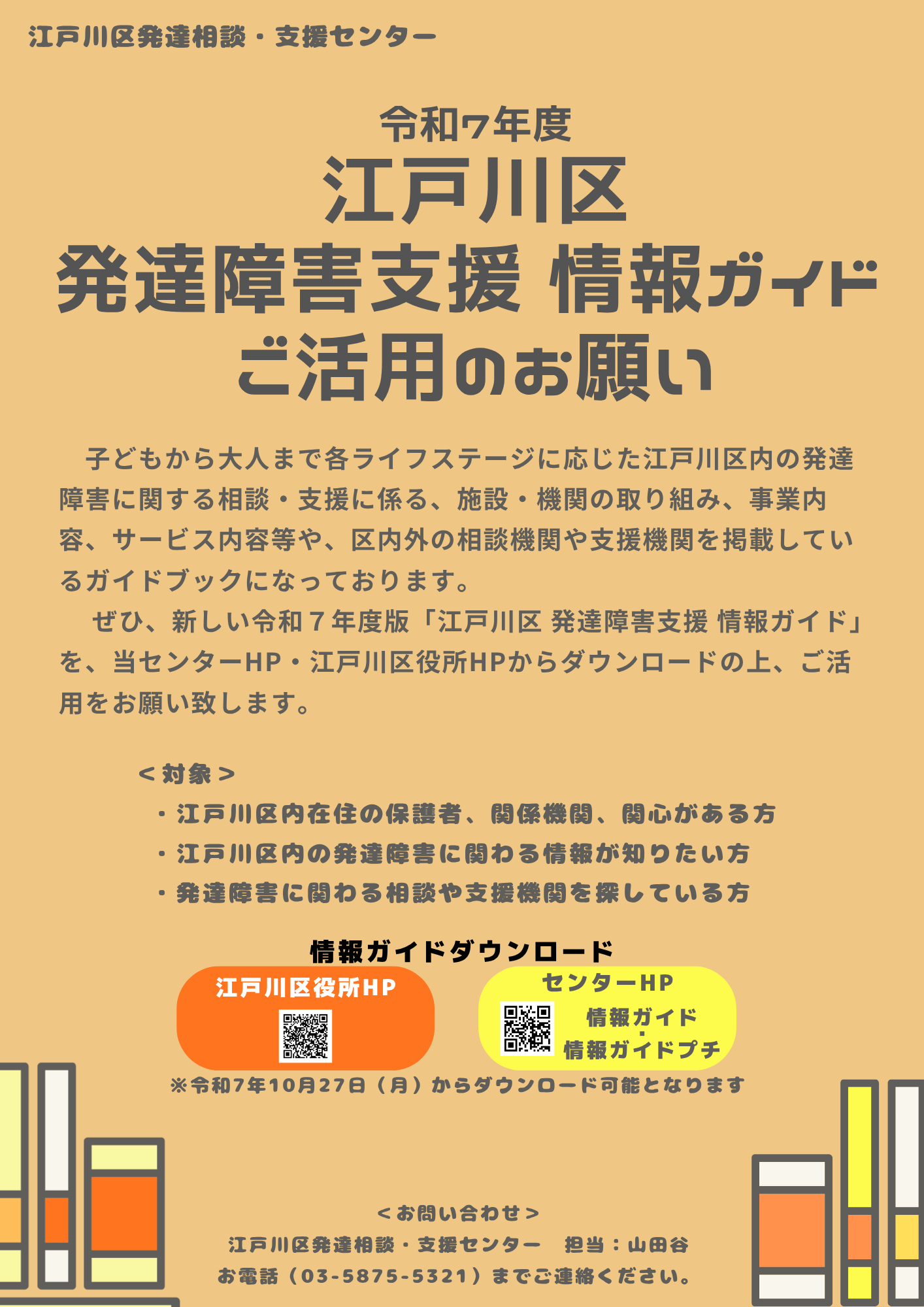 「江戸川区 発達障害支援 情報ガイド」には、各ライフステージに応じた江戸川区内の発達障害に関する相談・支援に係る、施設・機関の取り組み、事業内容、サービス内容等や、区内外の相談機関や支援機関を掲載しています。令和7年度版も、更に充実した内容となっております。