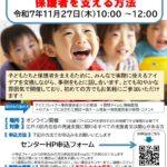 2025年9月30日 / 最終更新日時 : 2025年9月30日 user_name お知らせ 保護者向け 出前講座及び相談会「幼児期の子どもの発達と子育てについて」-がんばりすぎない子育て「ちょっとしたコツで子どもはのびのび育つ」- 子育てに正解はありません。日々の小さな関りの中に、子どもの育ちを支えるヒントが隠れています。がんばりすぎず、子どもの育ちに寄り添うために、今日から取り入れられるちょっとしたコツを皆さんと一緒に考えていきます。たくさんの方 […]